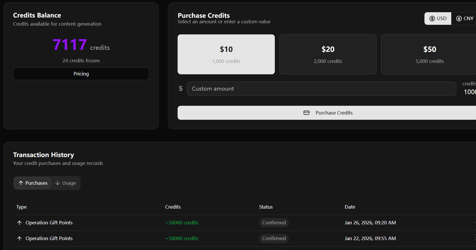 Points Consumption: Points consumption varies for different multi-models and tasks. Please check the "Pricing" page in the top-left corner of the website, and the points consumption record is located below the subscription page.