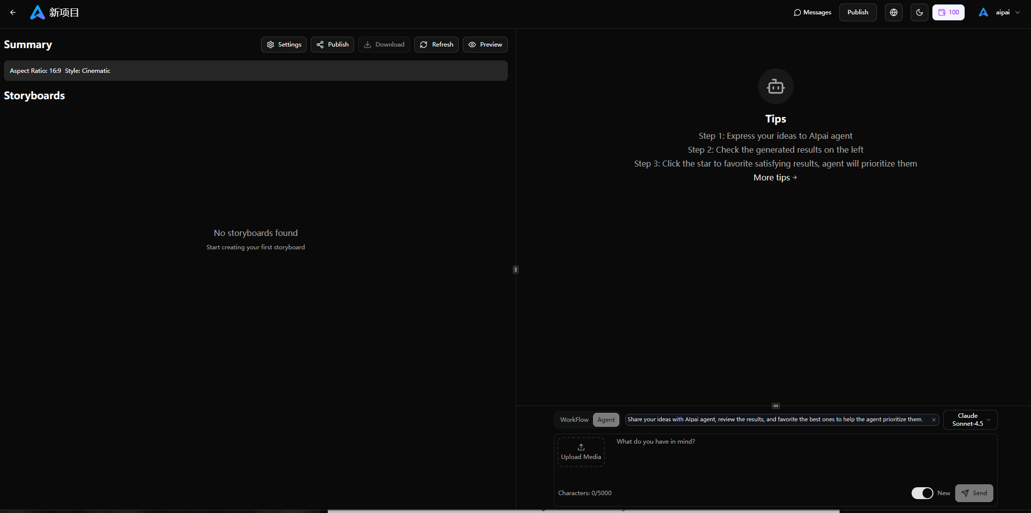 ——Right Agent Communication Area: Propose ideas and suggestions to AIpai, and execute and modify the video creation process.