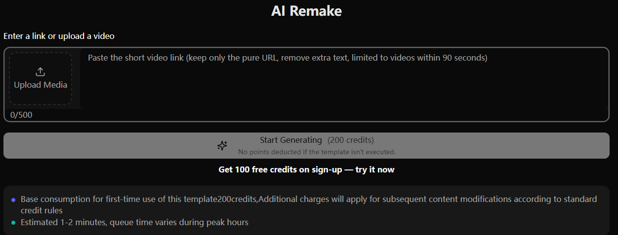The "Make the Same" function in the top-left corner of the website allows you to share your Douyin/Tiktok video link, provide a brief description, and create with just one click;