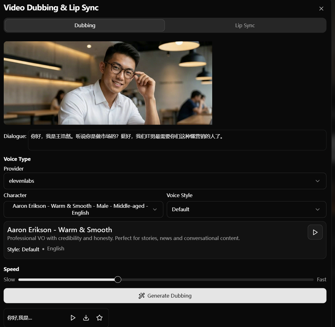 Lip-syncing: For animation videos, lip-syncing is generally not required, and the character's mouth can be made to move in the prompt; for non-animation videos, lip-syncing can be selected after voiceover generation in "Standard Mode".